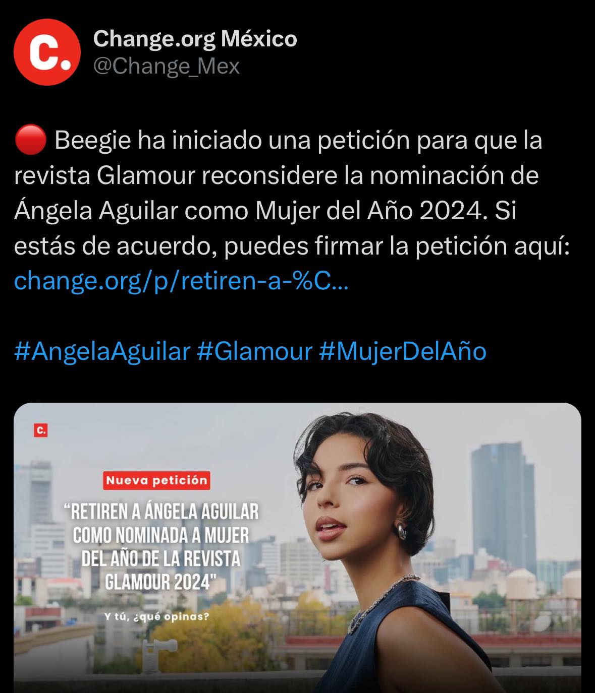 Luego de que la revista Glamour hiciera público que la cantante de música regional mexicana Ángela Aguilar es la “Mujer del Año” en la categoría de “Regional Music Award”, muchas personas se mostraron inconformes y se creó una petición en la plataforma Change.org para retirarle el premio.