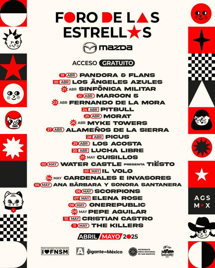 Tiësto, Pitbull, Scorpions, OneRepublic, Maroon 5 y The Killers encabezan la tan esperada cartelera de la Feria de San Marcos que también contarán con talento nacional como Los Acosta, Cristian Castro, Pepe Aguilar y Los Ángeles Azules.