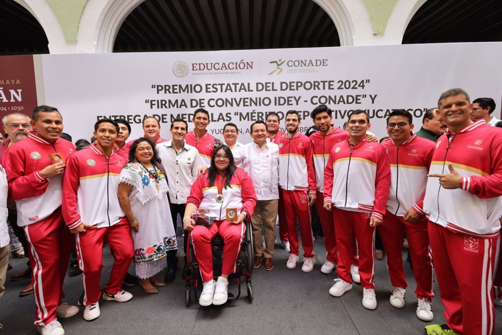 Asimismo, se reconoció al equipo de relevos 4×100 metros, de personas con discapacidad visual y a las gimnastas rítmicas con medallas de plata al Mérito Deportivo Yucateco en las categorías de deportes paralímpicos y de conjunto, respectivamente.