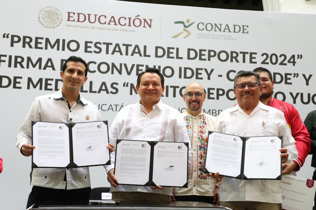 En el marco de la entrega del Premio Estatal del Deporte y Mérito Deportivo Yucateco 2024, encabezado por el Gobernador Joaquín Díaz Mena, los titulares del Instituto del Deporte de Yucatán (IDEY), Armín Lizama Córdoba, y de la Comisión Nacional de Cultura Física y Deporte (Conade), Rommel Pacheco Marrufo, firmaron el Convenio IDEY–CONADE.
