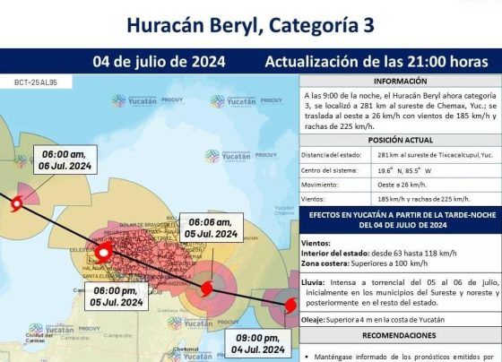 A las 9:00 de la noche, el Huracán Beryl ahora categoría 3, se localizó a 281 km al sureste de…