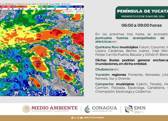 En las próximas tres horas, se pronostican Lluvias puntuales fuertes con Descargas Eléctricas, además de Chubascos en regiones y municipios…