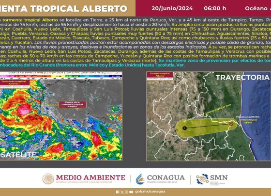 La Tormenta Tropical Alberto se localiza en tierra a 25 km al norte de Panuco, Veracruz y a 45 km…