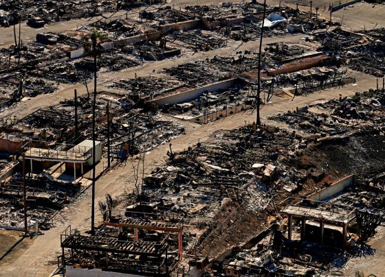 Una vista aérea muestra las casas destruidas en el incendio Palisades mientras los incendios forestales causan daños y pérdidas en…