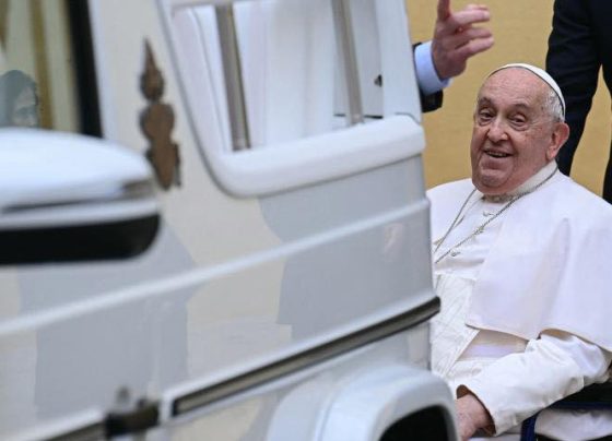 El Papa Francisco reacciona tras la presentación de un nuevo papamóvil totalmente eléctrico, en el Vaticano. El papa Francisco se…