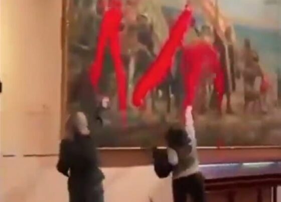 Dos activistas del colectivo Futuro Vegetal arrojaron pintura roja biodegradable al cuadro “Primer homenaje a Cristóbal Colón”, pintado por José…