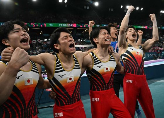 El equipo de Japón celebró después de ganar la medalla de oro durante la final por equipos masculinos de gimnasia…