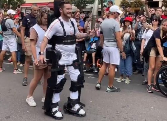 Kevin Piette, tenista parapléjico, camina con la antorcha olímpica gracias a un exoesqueleto. El exoesqueleto que el atleta usa para…