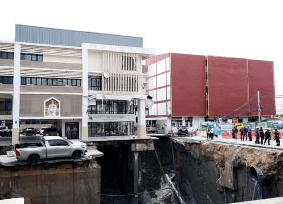 Un socavón de 50 metros de profundidad y aproximadamente 900 metros cuadrados se abrió frente al Hospital Vajira en Bangkok,…