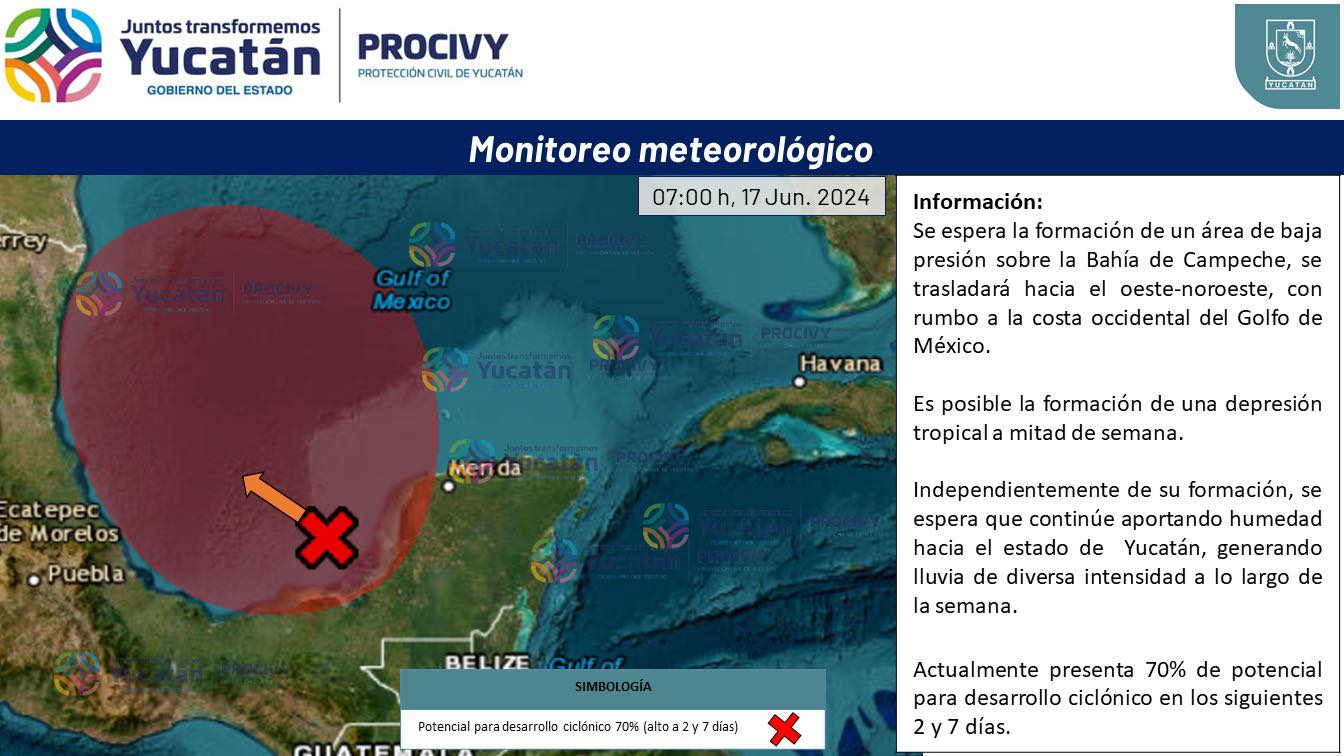 Se espera la formación de un área de baja presión sobre la Bahía de Campeche, generando lluvia de diversa intensidad a lo largo de la semana en el Estado de Yucatán.