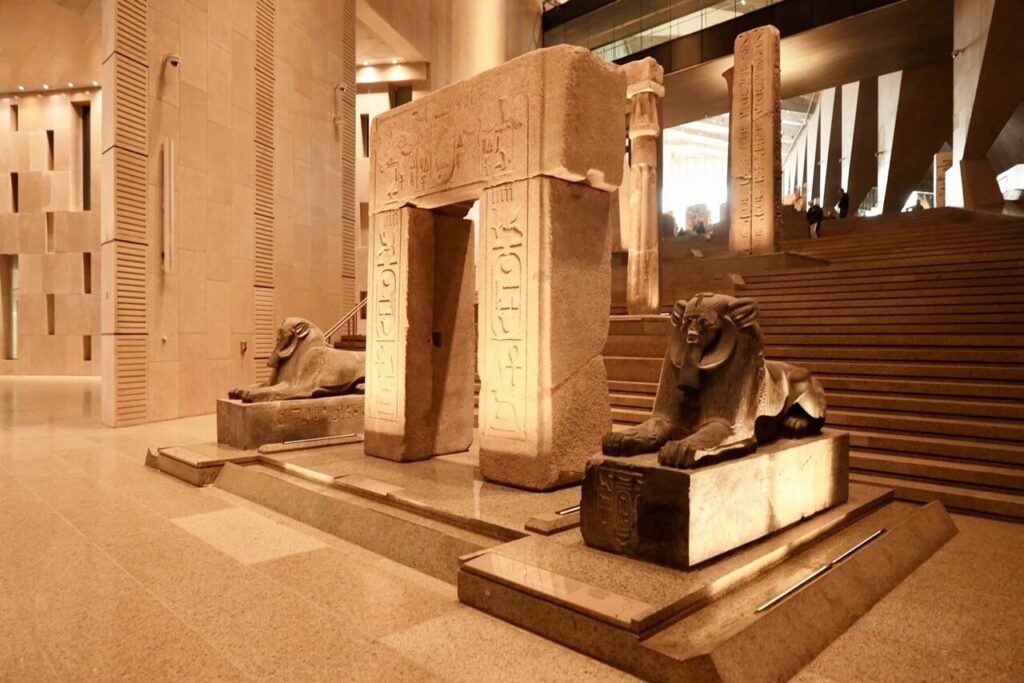 El GEM exhibe alrededor de 100,000 piezas arqueológicas, distribuidas en 24,000 metros cuadrados de espacio de exposición permanente. Su gran atractivo es el tesoro completo del faraón Tutankamón, compuesto por más de 5,000 objetos que no se habían mostrado juntos anteriormente. Además, la entrada principal recibe a los visitantes con la imponente estatua de Ramsés II, de 11 metros de altura y 83 toneladas de peso.