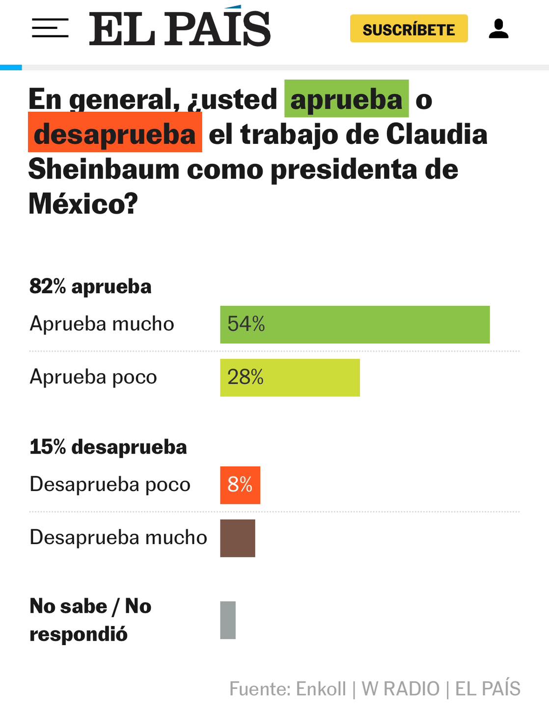 De acuerdo con una encuesta realizada por Enkoll para El País y W Radio, un 82% de los mexicanos aprueban la gestión de la presidenta de México, Claudia Sheinbaum Pardo, destacando que el 67% opina que el país ha mejorado en los seis meses de mandato, así como al 68% le genera confianza la manera en que la presidenta está llevando la relación con su homólogo estadounidense, Donald Trump.