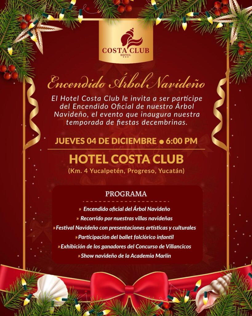 El Instituto de Seguridad Social para los Trabajadores del Estado de Yucatán (Isstey) invita al público en general al encendido oficial del Árbol Navideño en el Centro Vacacional – Hotel Costa Club, ubicado en el km 4 de Yucalpetén, municipio de Progreso.