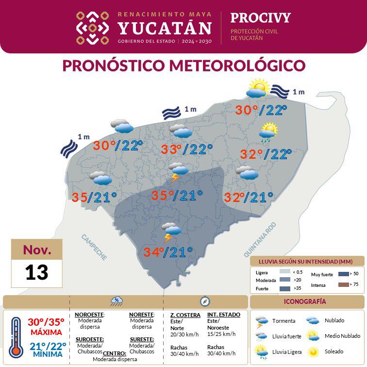 Este miércoles, debido al ingreso de humedad proveniente del Golfo de México y el Mar Caribe, se espera lluvia ligera por la mañana en los municipios del oriente del estado, posteriormente entre el mediodía y las 3:00 de la tarde, se registrarán chubascos dispersos en el centro y noroeste de Yucatán, mientras que en los municipios del sur se espera lluvia de mayor intensidad por la noche, la cual podrá estar acompañada de actividad eléctrica.