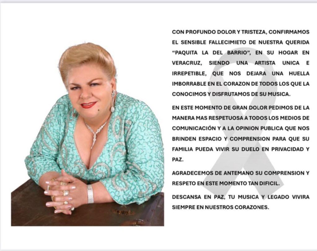 La querida cantante mexicana Paquita la del Barrio falleció a los 77 años, según revelaron sus representantes.