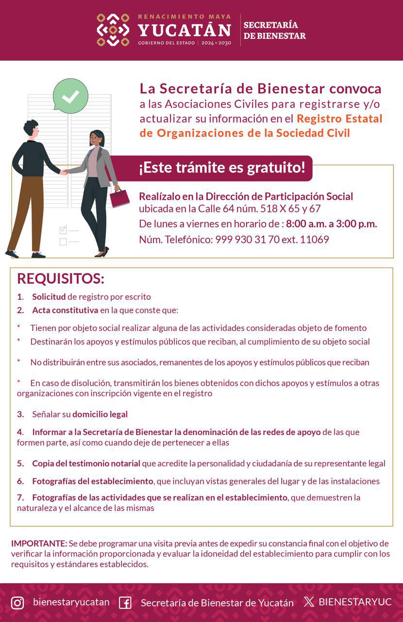 El Gobierno de Yucatán, a través de la Secretaría de Bienestar, invita a las asociaciones civiles a registrarse o actualizar su información de manera gratuita en el Registro Estatal de Organizaciones de la Sociedad Civil.