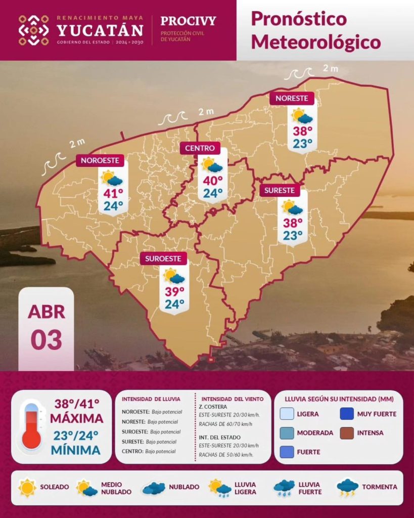 Temperaturas máximas entre los 38°C y 41°C en el interior del estado y de 36° a 38°C en el litoral, en la capital Yucateca, la temperatura máxima esperada será de 41°C.