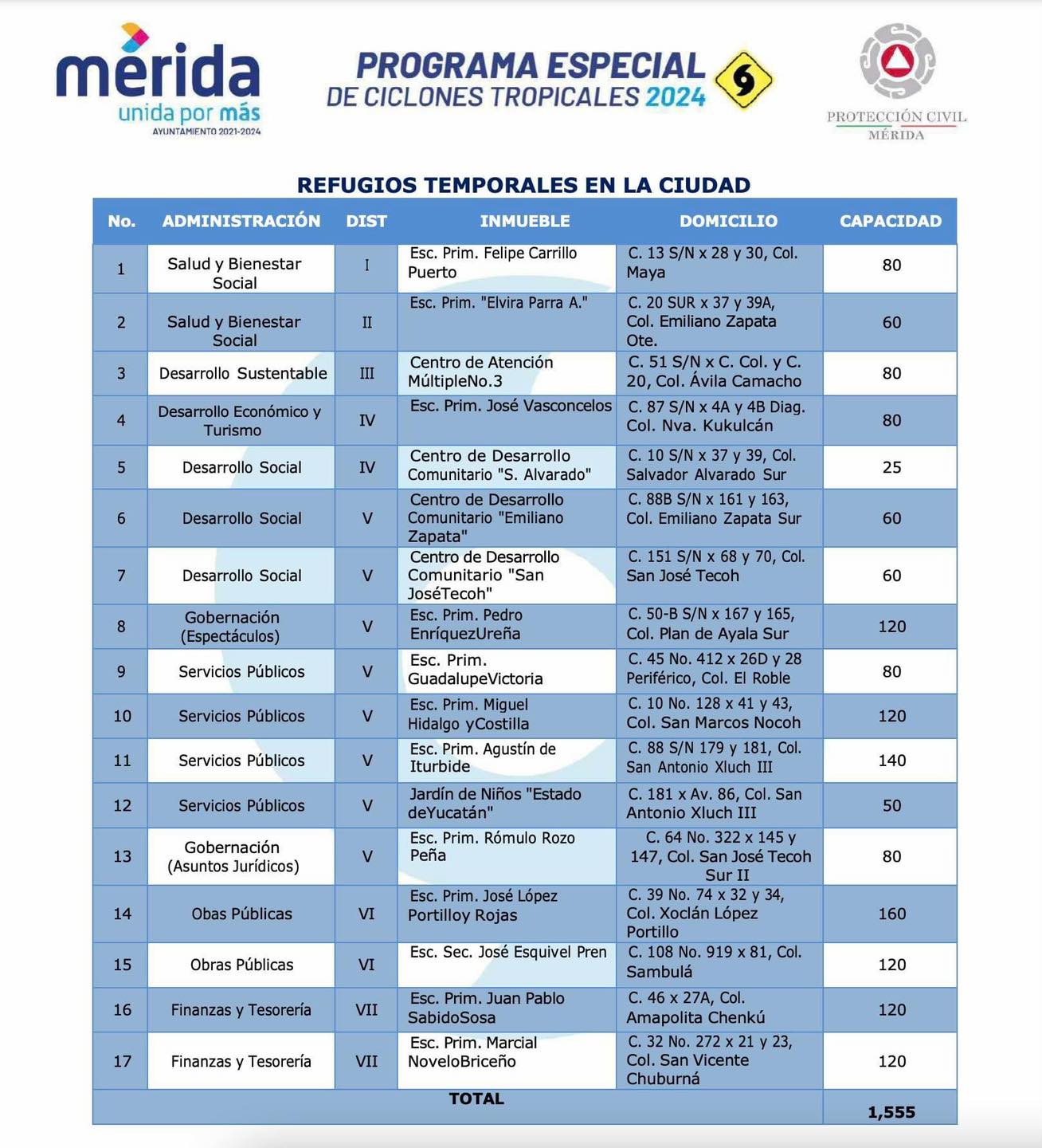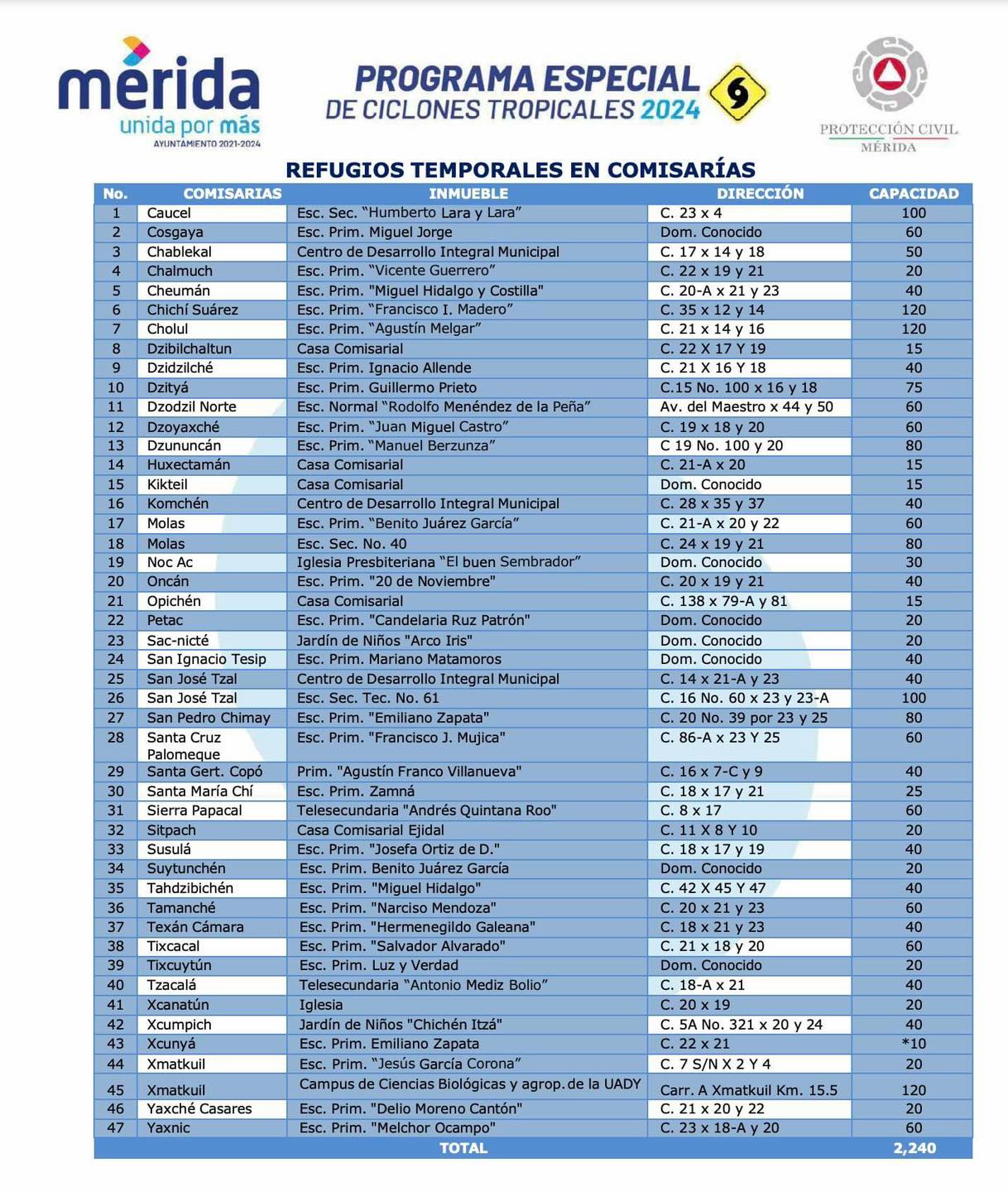 Protección Civil comparte la lista de refugios temporales en Mérida y comisarías, los cuales darán alojamiento, resguardo y servicios asistenciales ante la inminencia de la afectación por Ciclón tropical.