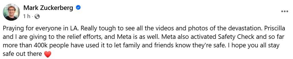 A través de su perfil de Facebook, Mark Zuckerberg compartió que se encuentra brindando apoyo por medio de Meta, implementando un control de seguridad para quienes lo necesiten. Detalló que, hasta ahora, más de 400K de persona lo han usado para saber si familiares, amigos y conocidos se encuentran a salvo tras los desastres ocurridos en Los Ángeles, Estados Unidos.