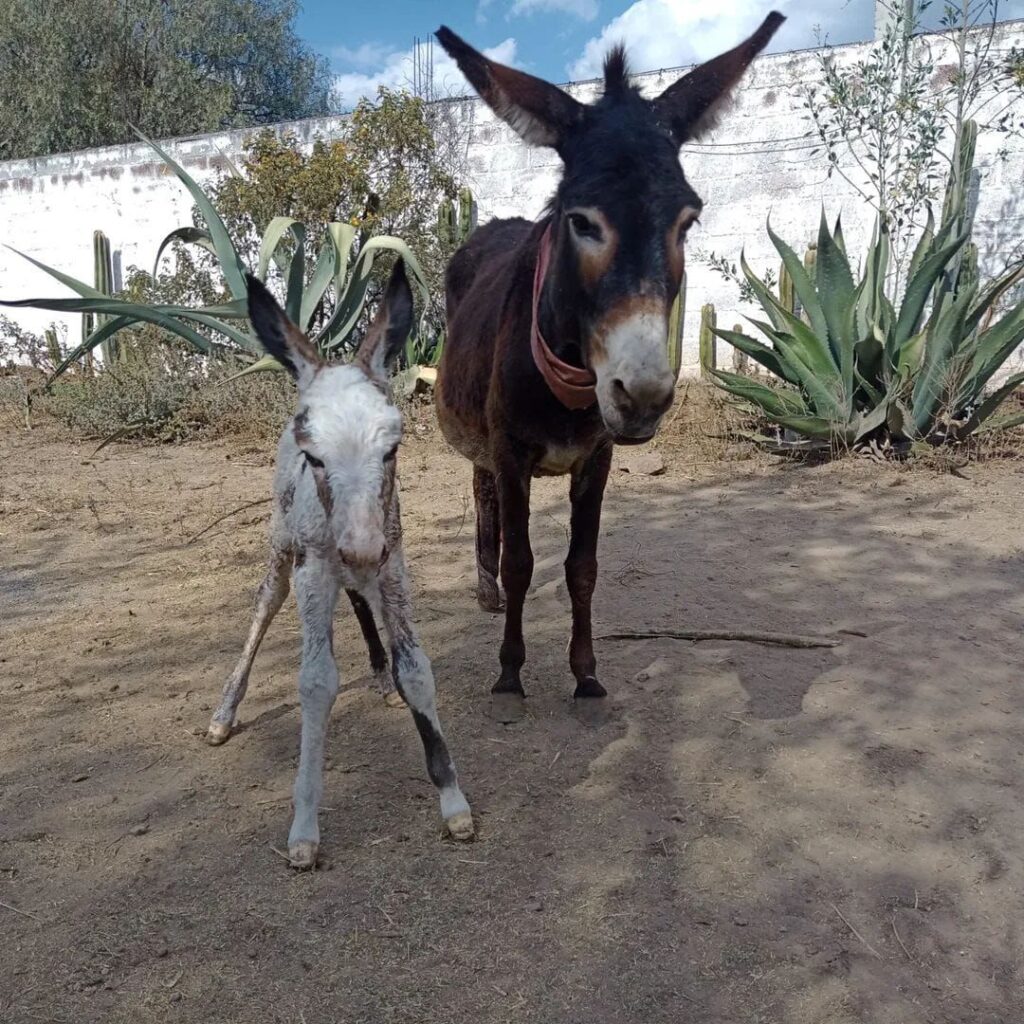 Almendrita, una burra de pelaje café, dio a luz a un pollino blanco con manchas cafés que ya camina junto a su madre. El evento fortalece los esfuerzos del santuario por evitar la extinción de esta especie emblemática, cuya población ha disminuido alarmantemente.