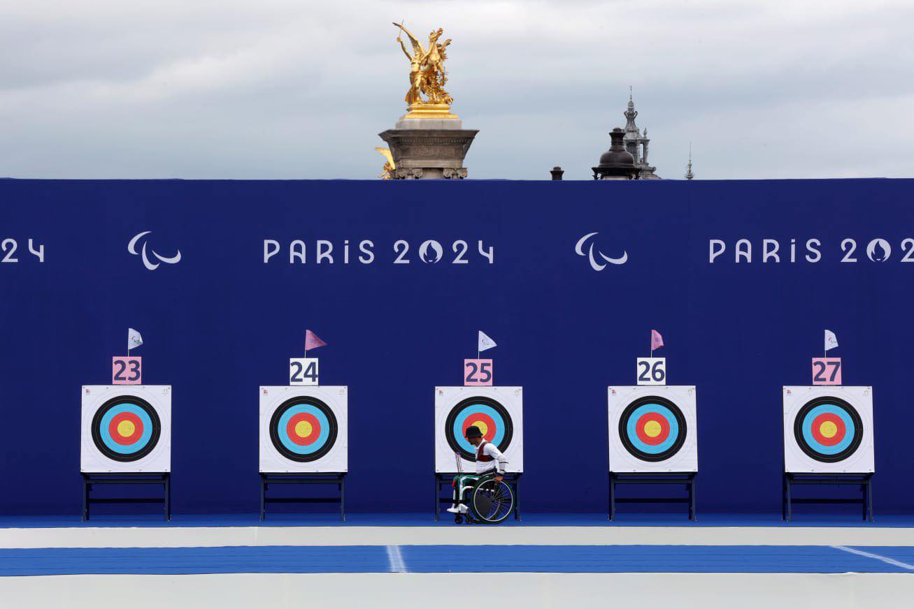 El seleccionado nacional de para tiro con arco, Samuel Molina, realiza su primer entrenamiento en la Explanada de los Inválidos.