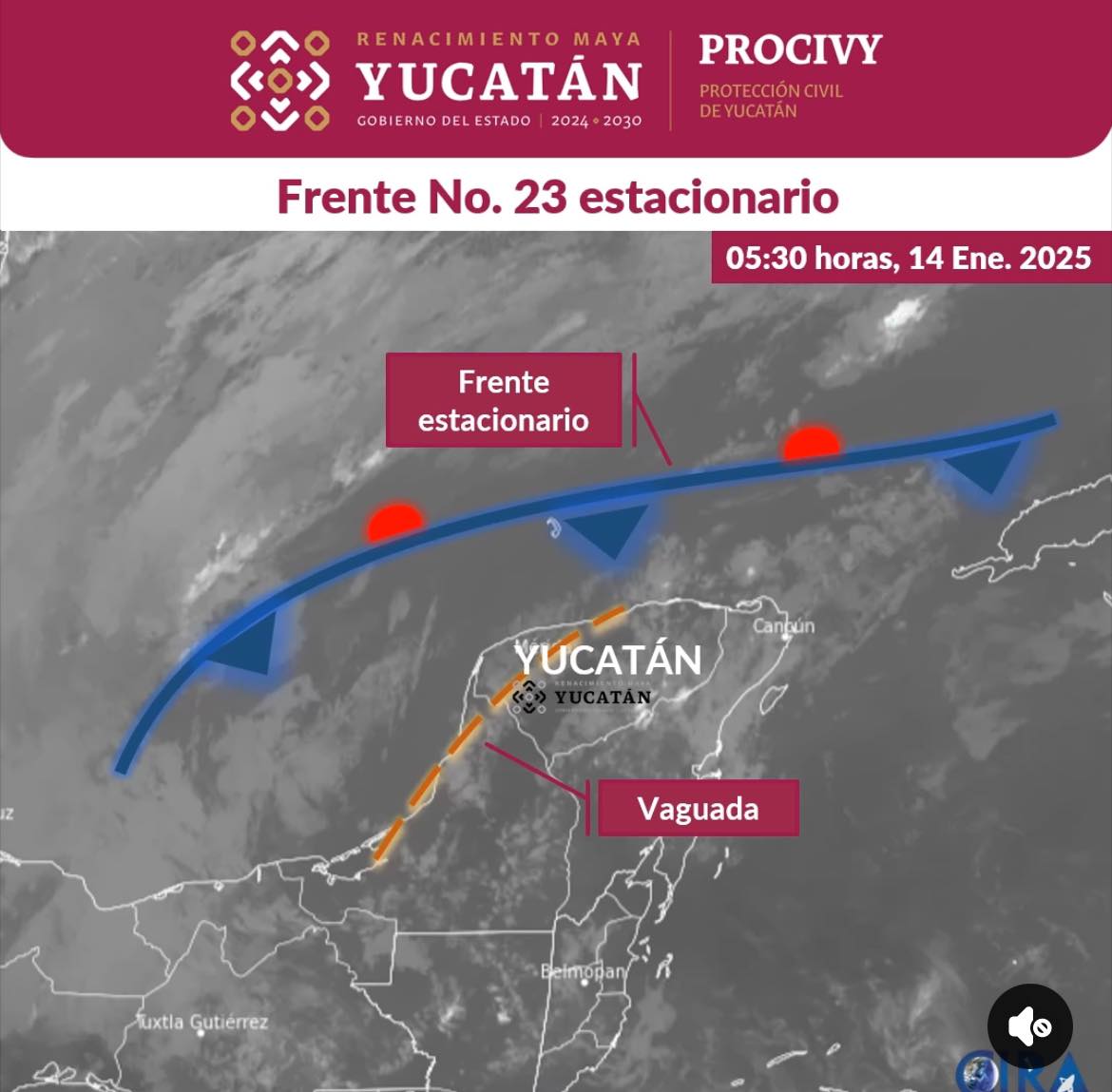 Debido a que el Frente Frío No. 23 se mantendrá como estacionario al norte del estado de Yucatán, es decir sobre el Golfo de México, no se espera descenso en las temperaturas, manteniéndose el ambiente caluroso en el día.