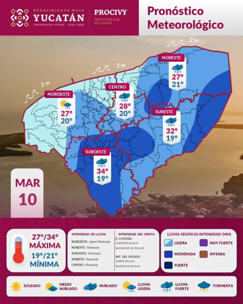 En Mérida, la lluvia dispersa estará presente hasta las 10:00 hs, predominando los nublados con posible llovizna ocasional hasta las 15:00 h.