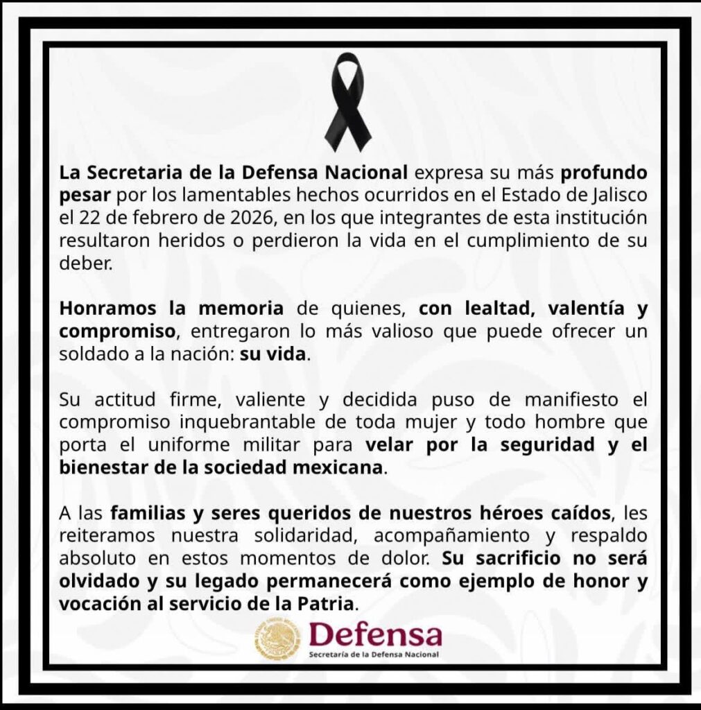 La Secretaría de la Defensa Nacional (Sedena) rindió homenaje a sus elementos que perdieron la vida en cumplimiento del deber durante intensos operativos en Jalisco contra el crimen organizado. La dependencia reiteró su compromiso inquebrantable de acompañamiento y solidaridad con las familias de los caídos.