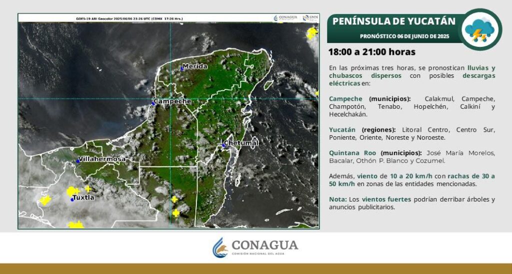 Chubascos y viento con rachas de 30 a 50 km/h se pronostican para el resto de la tarde y las primeras horas de esta noche en la Península de Yucatán.