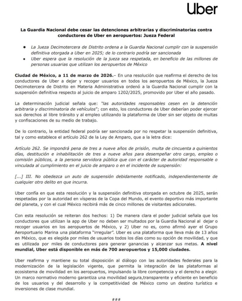 Uber solicitó formalmente que la Guardia Nacional deje de detener a sus conductores en aeropuertos mexicanos, invocando un amparo federal que permite operar en estas zonas. Esto surge tras el reforzamiento de operativos contra plataformas digitales, impulsado por protestas de taxistas.